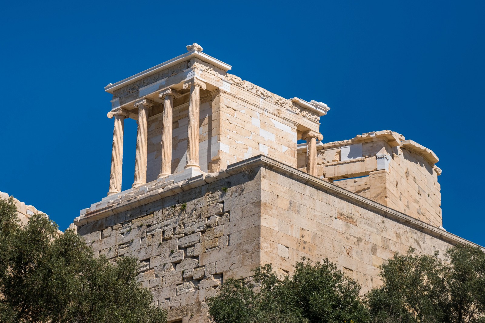 El Templo de Atenea Niké, también conocido como Templo de Niké Aptera, es un templo tetrástilo anfipróstilo, es decir, con cuatro columnas exentas en la parte delantera y otras cuatro en la trasera, hecho de mármol blanco del monte Pentelos. Mide aproximadamente 8 x 5 metros, pero algunos trucos de construcción hacen que el templo parezca más grande de lo que es en realidad.