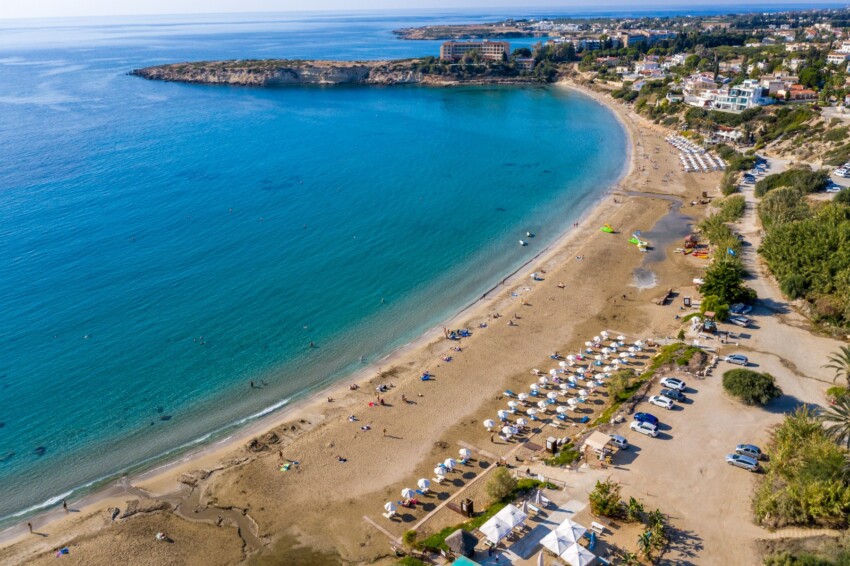 Coral Bay, considerada la playa más hermosa de toda la costa oeste de Chipre, está a sólo 12 km de Pafos. Una cala suavemente curvada, arena dorada, aguas tranquilas y transparentes: es perfecta para horas de relajación o aventuras acuáticas. Es una playa equipada, con alquiler de sombrillas y quioscos.