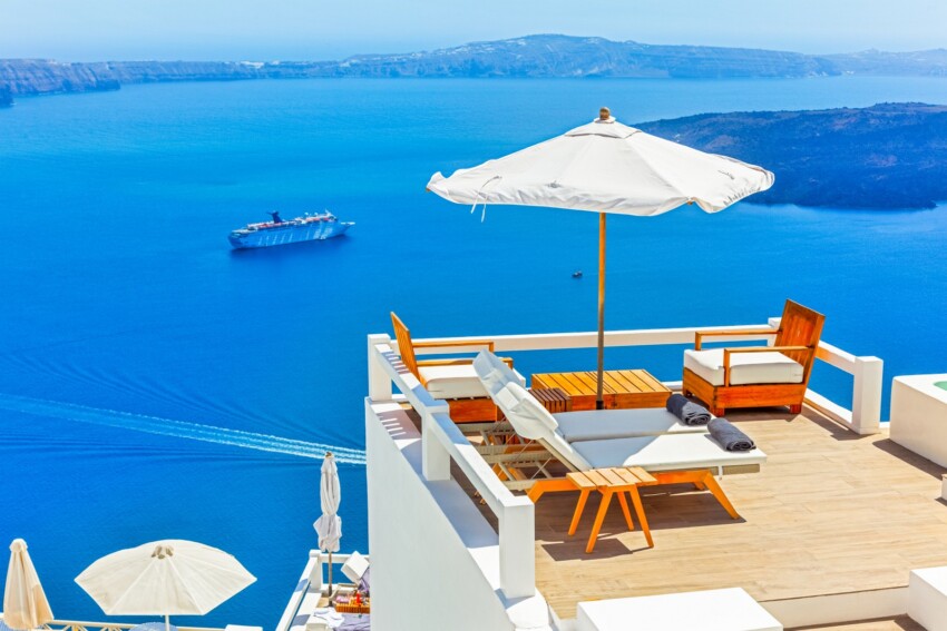 Los alojamientos más comunes en Santorini son hoteles boutique con piscinas en la azotea y lujosas villas, pero si reservas con antelación, puedes encontrar pensiones asequibles y hoteles familiares.