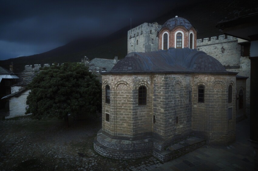 Simonopetra es quizá el monasterio más espectacular del Monte Athos debido a su ubicación única, construido sobre una roca de 330 metros de altura que se eleva verticalmente desde el mar. Fundado en 1257 por San Simón, el complejo presenta una atrevida arquitectura que desafía las leyes de la gravedad, con edificios en voladizo que parecen estar suspendidos en el vacío. La estructura actual data del siglo XVIII, después de que un incendio destruyera el edificio medieval original.