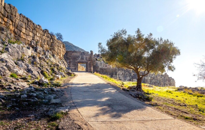 El símbolo de Micenas es la Puerta del León, la majestuosa entrada a la ciudad. La puerta, de más de tres metros de altura, está coronada por un monolito decorado con dos leones enfrentados a ambos lados de una columna. Es casi seguro que la columna sirvió para sostener una estatuilla, pero no se pudo definir su tema. ¿Representaba al hombre más poderoso de la ciudad? ¿Un animal sagrado? ¿Una divinidad? La respuesta sigue rodeada de misterio y aumenta el atractivo de entrar en la antigua ciudad.