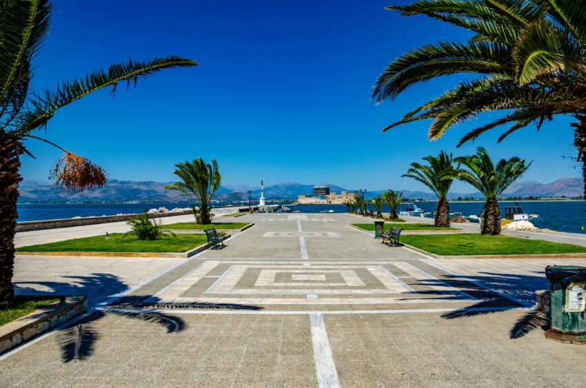 Nauplia cuenta con un paseo marítimo muy característico, que comienza en el centro y recorre el promontorio que forma el extremo occidental de la ciudad hasta desembocar en una playa rocosa.