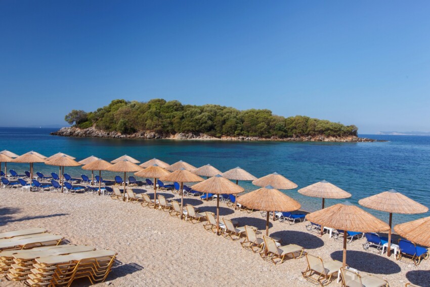 La playa de Bella Vraka es sin duda la más emblemática y fotografiada de Syvota. Esta franja de fina arena blanca conecta tierra firme con el islote de Mourtemeno, creando un impresionante «puente natural» que emerge con la marea baja, lo que permite cruzarlo a pie. Las aguas turquesas y transparentes que la rodean adquieren tonalidades cambiantes gracias al fondo marino de arena blanca. La playa está parcialmente organizada, con un pequeño chiringuito y alquiler de sombrillas en la parte principal, mientras que la parte del islote sigue siendo más salvaje y natural, ideal para los que buscan más tranquilidad.