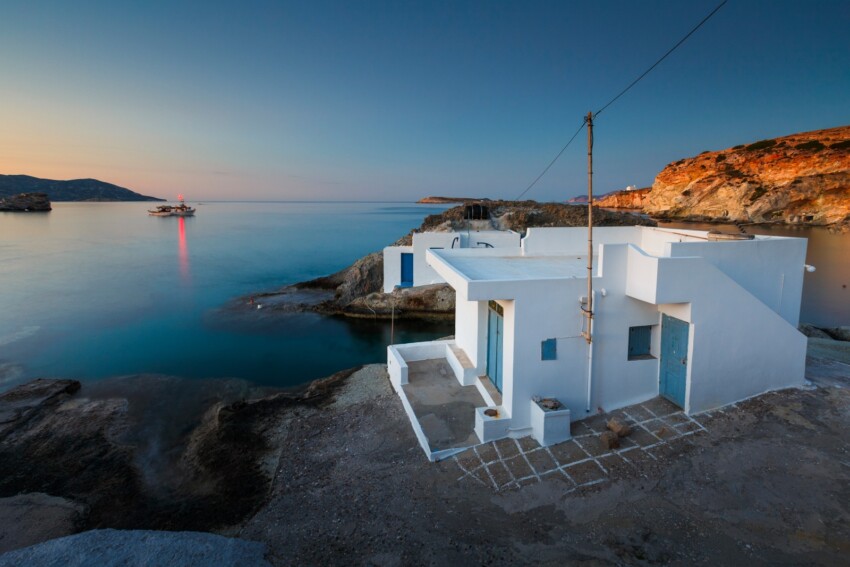 Goupa es un pequeño y pintoresco pueblo costero que encarna la esencia de la vida marina de Kimolos. Aquí se pueden admirar las características syrmata, antiguas construcciones excavadas en la roca con puertas de colores que los pescadores utilizaban como refugio para sus barcas durante el invierno y protección contra las tormentas del Egeo.