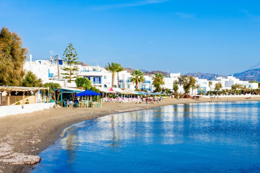 La playa de Plaka se extiende casi 4 kilómetros a lo largo de la costa oeste, y representa una de las costas arenosas más espectaculares de las Cícladas. Esta larguísima extensión de fina arena blanca está bañada por aguas cristalinas que van del turquesa al azul profundo, creando un efecto visual que recuerda al Caribe.
