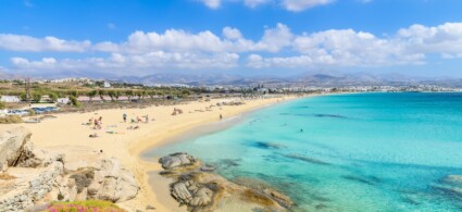 Su situación estratégica en la costa este garantiza unas condiciones de viento ideales para los deportes acuáticos, mientras que el fondo arenoso de suave pendiente también hace que la playa sea perfecta para familias con niños. La vista panorámica se extiende hacia el pequeño islote de Dryonisi y ofrece sorprendentes destellos hacia las demás islas de las Cícladas Meridionales.
