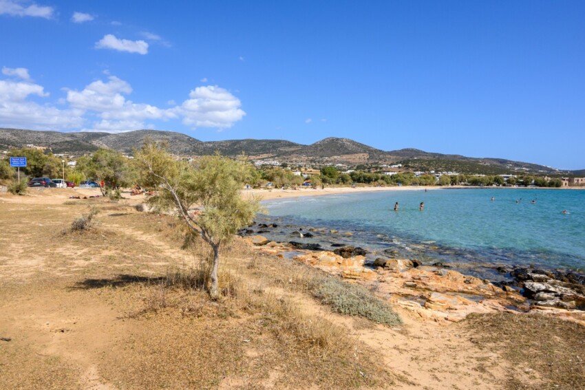 La playa está dividida en dos zonas distintas: una totalmente equipada con sombrillas, tumbonas y juegos hinchables para niños, y otra más salvaje con tamarindos centenarios que proporcionan sombra natural. Su céntrica ubicación permite combinar mar y cultura, con la posibilidad de visitar la iglesia de Panagia Katapoliani y el centro histórico de Parikia sin renunciar a la relajación junto al mar.