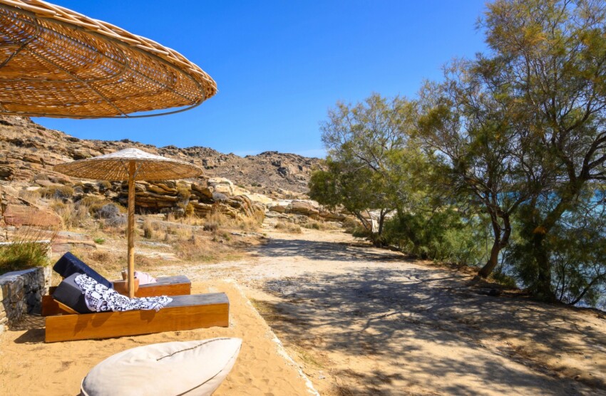 Faragas se esconde en una bahía protegida de la costa sur, donde la arena dorada se extiende bajo una corona de pinos marítimos que perfuman el aire marino. Esta playa representa el equilibrio perfecto entre comodidades modernas y belleza natural, con un elegante club de playa que respeta su entorno. Las aguas verde esmeralda de Faragas están protegidas de los vientos dominantes, lo que proporciona unas condiciones ideales para la relajación.