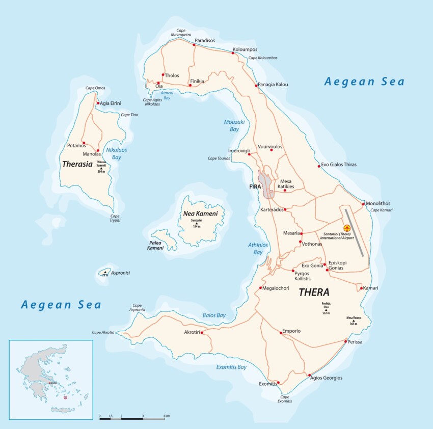 Santorini forma parte del archipiélago de las Cícladas, del que, junto con la pequeña isla de Anafi, es la más meridional.