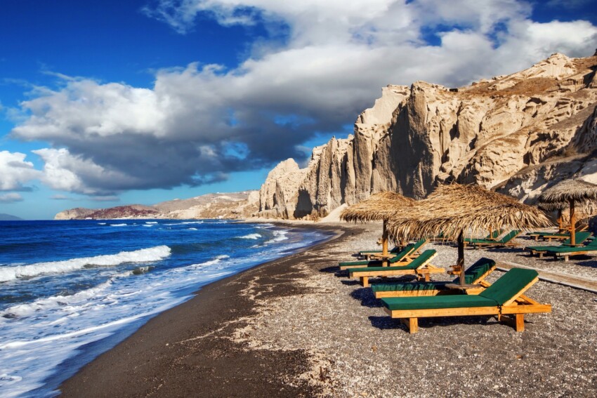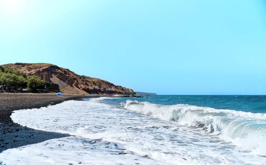 Es cierto que no debes esperar playas caribeñas de arena blanca y mar turquesa: el origen volcánico de Santorini también ha dejado su huella en las playas de la isla, que se caracterizan por su arena oscura, agua azul e imponentes acantilados sobre el mar.