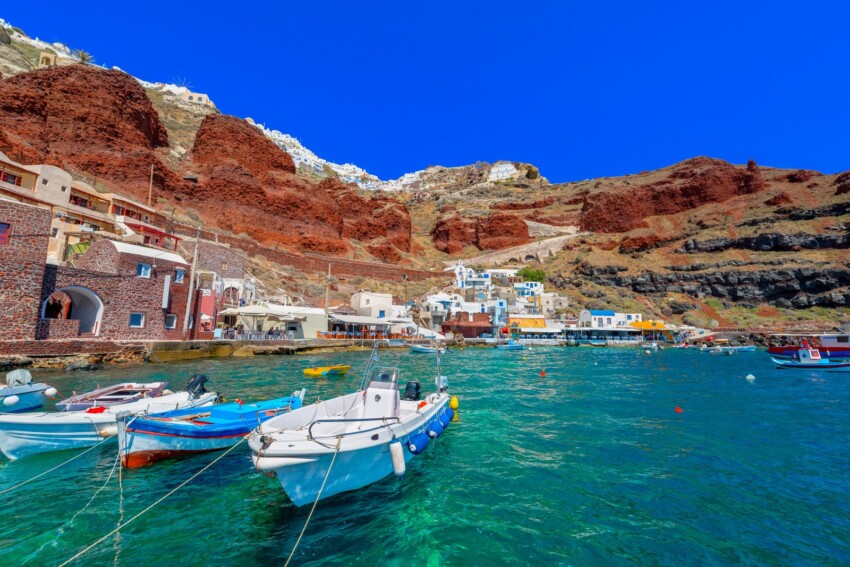 A diferencia de las grandes playas de arena de Santorini, la bahía de Ammoudi (o bahía de Amoudi) se caracteriza por un pequeño puerto pesquero de aguas turquesas cristalinas y rocas volcánicas de tonos rojizos que crean un espectacular contraste de colores. Sólo se puede acceder a la bahía a pie por un empinado sendero que desciende desde Oia, lo que la convierte en un oasis de tranquilidad a pesar de su proximidad a uno de los pueblos más visitados de la isla.