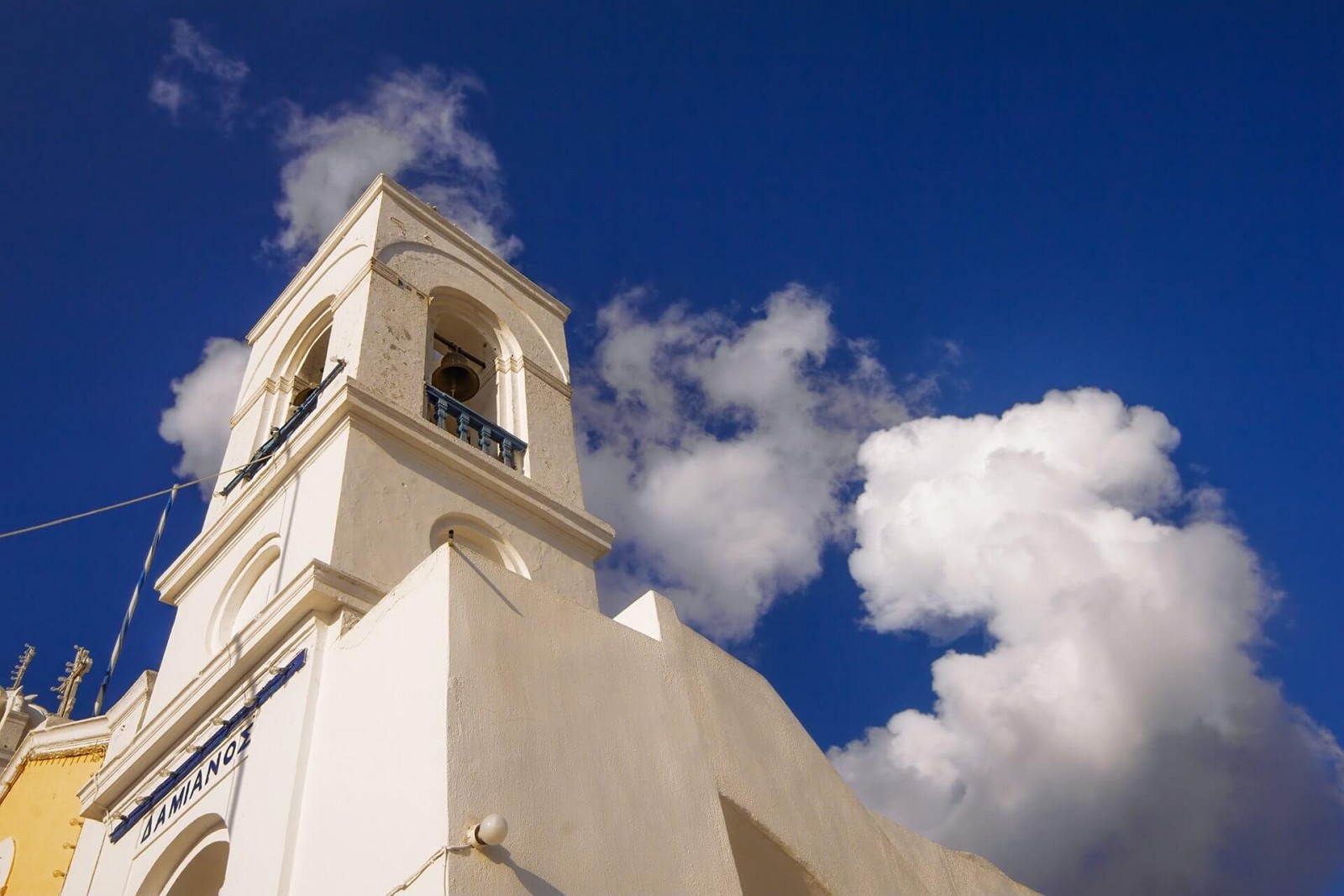 La iglesia de Panagia Isodion, situada en la plaza principal, destaca por sus iconos y su peculiar calendario de santos compuesto por 365 miniaturas que representan a los santos de la Iglesia Ortodoxa Griega, uno por cada día del año. También es muy especial el campanario en forma de arco que uno se encuentra al recorrer la calle principal del pueblo: una pieza arquitectónica única que crea un pasadizo bajo el que pueden pasar tanto personas como coches.