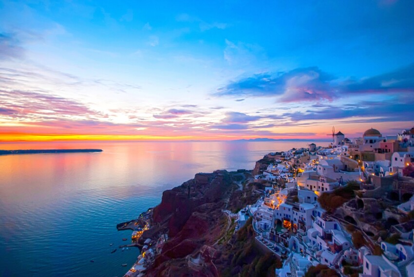 Las puestas de sol de Oia están consideradas entre las más bellas del mundo, una experiencia mística que atrae a cientos de visitantes cada atardecer. Cuando el sol comienza su descenso hacia el horizonte, la atmósfera del pueblo se transforma: una luz dorada envuelve las casas blancas, las cúpulas azules parecen brillar aún más y el mar de la caldera se tiñe de mil matices.