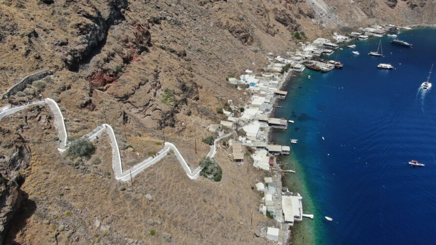 Desde el puerto de Ammoudi (Oia): es la conexión más rápida, con pequeñas embarcaciones que salen a diario y tardan sólo 10-15 minutos en cruzar el brazo de mar. Desde el puerto de Athinios: transbordadores más grandes que tardan unos 40-45 minutos en realizar la travesía. Son los únicos que también pueden transportar vehículos.
