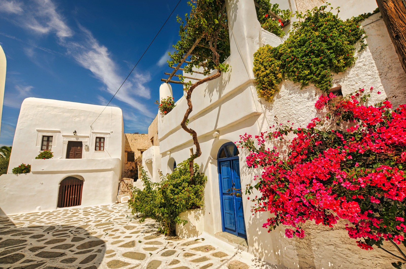 El pueblo está dividido en dos partes: Kastro, la zona más antigua construida en el siglo XVI al borde de un acantilado como defensa contra los piratas, y Horio, que conserva todas las características de la arquitectura tradicional de las Cícladas, con sus casas blancas de ventanas azules y pintorescas callejuelas bordeadas de flores.