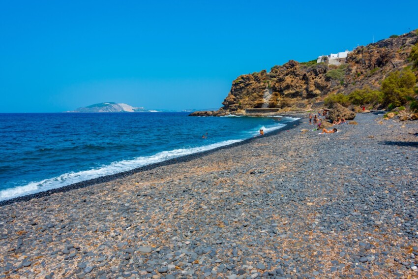 Se extiende como una larga franja de arena y guijarros oscuros a lo largo de la costa sur, a la que se llega por una carretera panorámica que termina en una gran explanada de tierra. Esta playa ofrece tranquilidad absoluta y aguas limpias, ideal para los que buscan soledad y contacto directo con la naturaleza volcánica. El camino continúa hasta Pachia Ammos, caracterizada por grandes dunas y un entorno salvaje que requiere un paseo de unos 15 minutos.