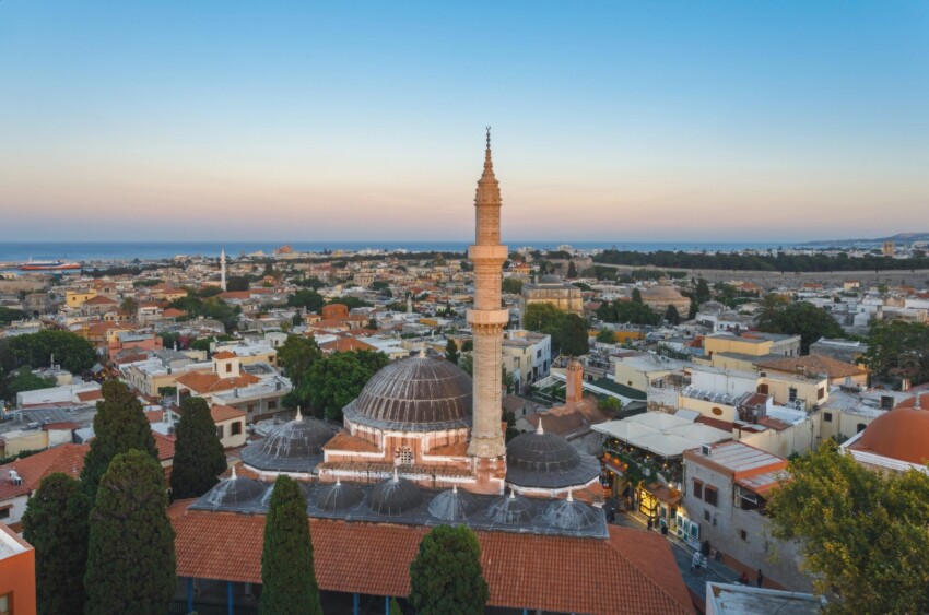 Construida en 1522 para conmemorar la conquista otomana de Rodas por Solimán el Magnífico, esta elegante mezquita representa el ejemplo más antiguo e importante de arquitectura islámica en la isla. Erigida sobre los restos de una iglesia bizantina dedicada a los Apóstoles, simboliza la transición de la era cristiana a la musulmana. La arquitectura combina elementos bizantinos y otomanos en una síntesis armoniosa: la cúpula central se hace eco de la tradición bizantina, mientras que el minarete rosa de 35 metros de altura presenta las decoraciones geométricas típicas del arte islámico.