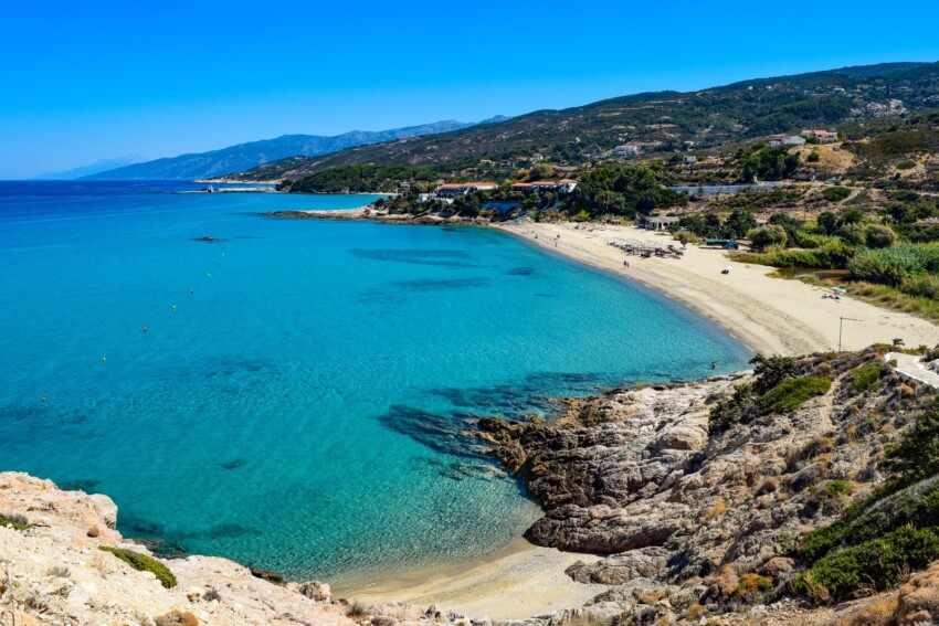 No te pierdas Nas, una playa de guijarros situada en la desembocadura de un arroyo que forma una laguna natural durante los meses de invierno. Rodeada de altos acantilados y exuberante vegetación, Nas era sagrada para la diosa Artemisa en la antigüedad, como demuestran los restos del templo visibles en la colina de arriba. Las aguas son especialmente frescas y claras gracias al manantial de agua dulce, lo que crea un microclima único.