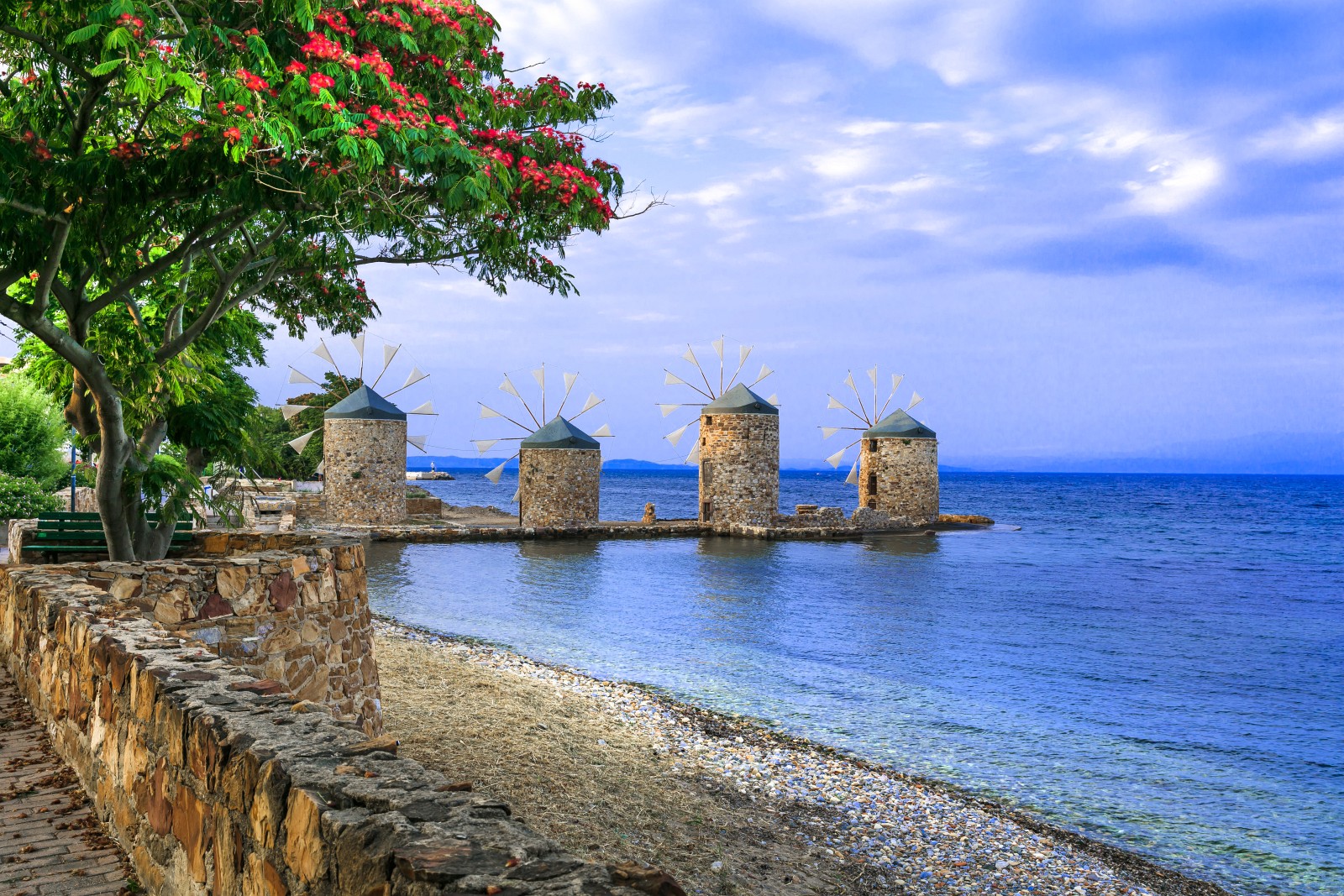 Situada a sólo 8 kilómetros de la costa turca, Quíos cuenta con más de 200 kilómetros de costa con una extraordinaria variedad de paisajes marinos. Es la quinta isla más grande de Grecia y la décima del Mediterráneo, y está situada entre las islas de Samos, Ikaria y Lesbos. Las aguas cristalinas del Egeo bañan playas que van desde bahías resguardadas, perfectas para familias, hasta costas salvajes de meltemi, ideales para los entusiastas de los deportes acuáticos.