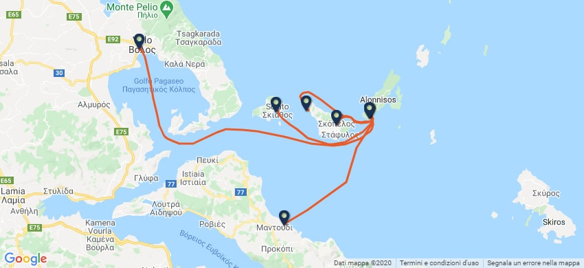 Los ferrys a Alonissos (ruta a Skopelos/Skiathos) no salen del puerto del Pireo, sino del puerto de Agios Kostantinos, al que se puede llegar desdeel aeropuerto de Atenas en autobús directo. La duración del traslado del aeropuerto al puerto es de unas dos horas y media; la misma duración para la travesía marítima de Agios Kostantinos a Alonissos.