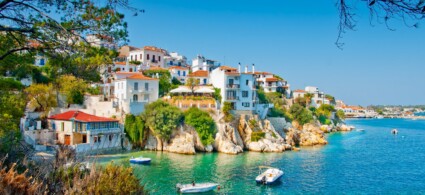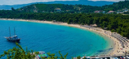 Una de las ventajas de elegir no alojarte en la ciudad es que estarás más cerca de una de las muchas y magníficas playas por las que es conocida la isla. Hay que decir que sigue habiendo instalaciones turísticas, pero en menor medida que en la ciudad de Skiathos. Sea cual sea el lugar que elijas para tu viaje, no te pierdas los numerosos restaurantes típicos donde podrás probar la sabrosa cocina griega.