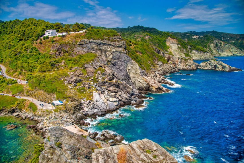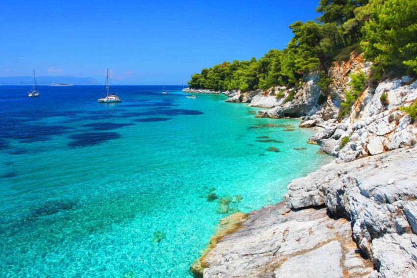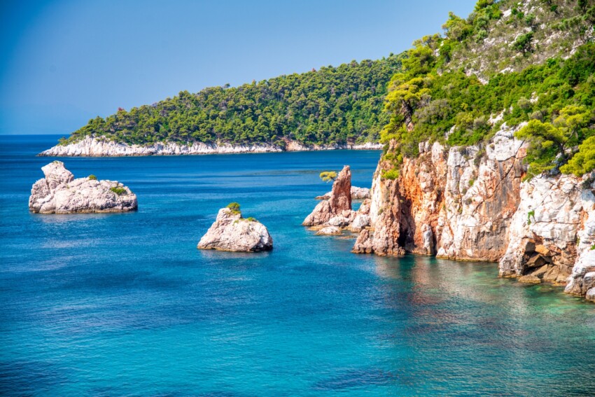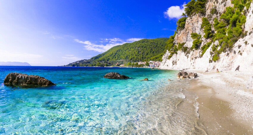 A diferencia de las islas más turísticas del archipiélago, Skopelos ha conservado su carácter auténtico y sus playas siguen ofreciendo paisajes salvajes y vistas impresionantes. La mayor parte de la costa se compone de arena gruesa mezclada con guijarros, con aguas de increíble transparencia que van de tonos turquesa a azul cobalto.
