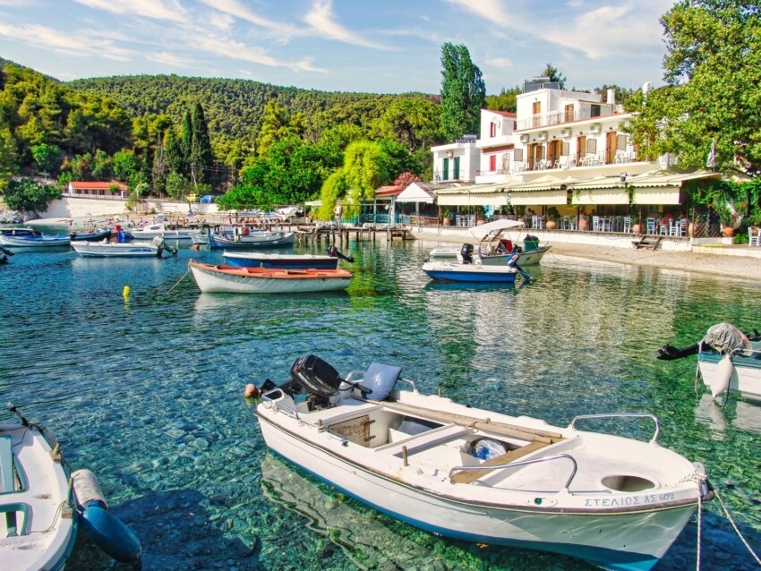 Agnontas es más que una playa: es un pintoresco pueblo costero que conserva el encanto de la autenticidad griega. La pequeña bahía de guijarros está protegida por ondulantes colinas cubiertas de pinos y alberga algunas de las tabernas de pescado más renombradas de la isla, como la famosa Taberna de Pescado Mouria, famosa por sus espaguetis de langosta.