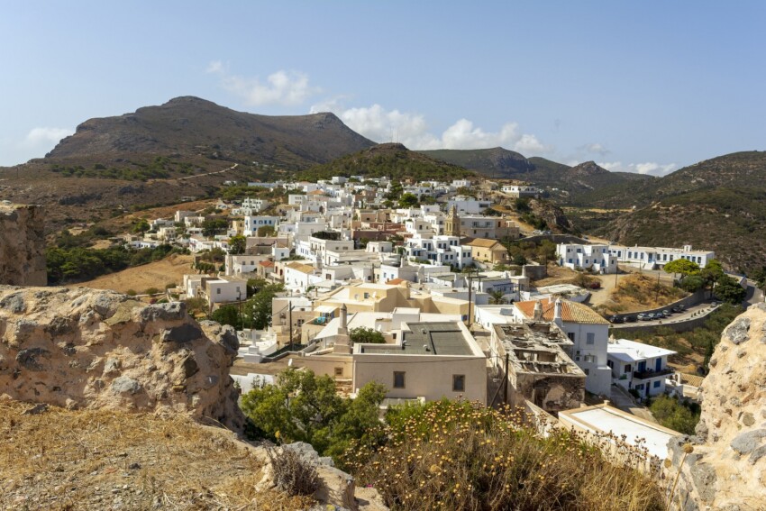 La capital de la isla, Chora, es una típica ciudad griega aferrada a la ladera de una colina, con su inevitable cascada de casitas blancas. Tiene poco más de 200 habitantes: este número aumenta exponencialmente en verano, pero Chora sigue siendo una ciudad tranquila, complaciente con sus pequeños tesoros. Dispone de los servicios esenciales y abundan los pequeños restaurantes y tabernas tradicionales: nada lujoso, pero la cocina es sabrosa y los precios muy buenos.