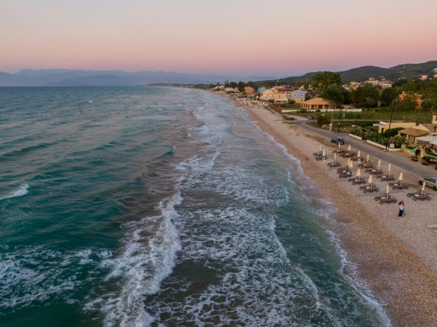 Avlaki, cerca de Kassiopi, está formada por pequeños guijarros blancos y rodeada de fragantes matorrales mediterráneos. Esta playa ventosa ofrece un entorno natural de rara belleza, donde los guijarros lisos reflejan la luz creando una atmósfera casi surrealista. La vegetación salvaje desciende hasta el mar, perfumando el aire con esencias de mirto, romero y retama.