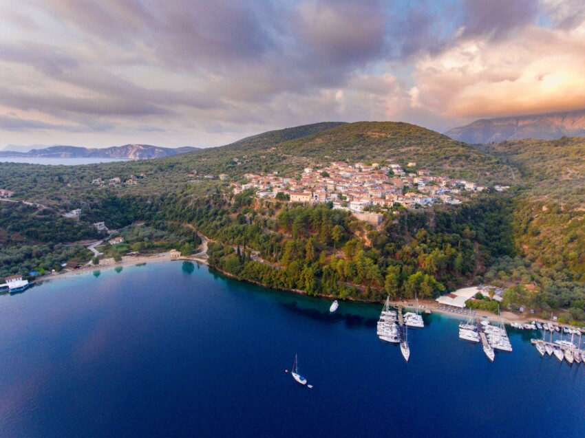 Spartochori ocupa una posición espectacular en la costa norte de la isla, encaramado en una colina que ofrece impresionantes vistas panorámicas de la bahía de Spilia y la isla de Skorpios. Este encantador pueblo conserva la arquitectura tradicional de las islas Jónicas, con casas blancas con contraventanas de colores y patios llenos de flores metidos entre callejuelas empedradas.