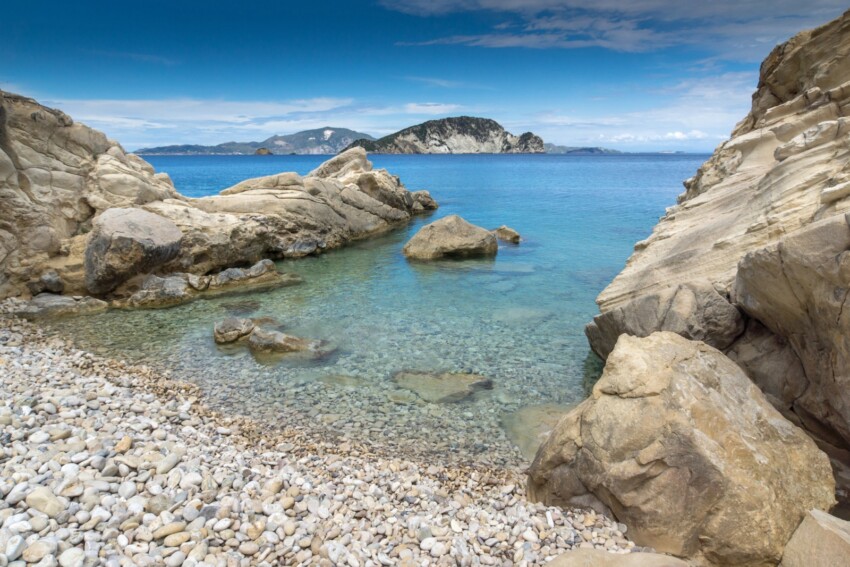 Las playas de la costa oeste de Zante, a diferencia de la oriental, caracterizada por muchas orillas largas y arenosas y, por tanto, ideal para familias, están enclavadas entre las altas rocas.