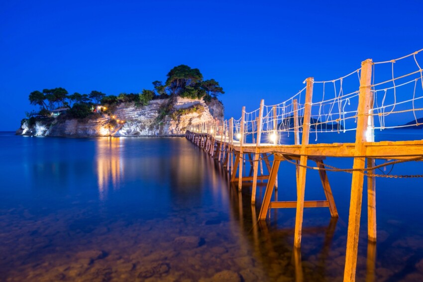 La isla de Cameo es uno de los lugares más exclusivos y fotografiados de Zante, un diminuto islote privado conectado a tierra firme por un puente de madera suspendido sobre aguas cristalinas. Situada en la bahía de Laganas, esta isla de forma artificial alberga un elegante club de playa que combina lujo discreto y belleza natural, lo que la convierte en un destino popular para aperitivos al atardecer y fiestas exclusivas.