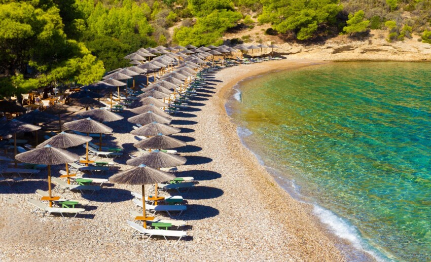 Le spiagge di Spetses si caratterizzano per la loro varietà e per l’acqua cristallina che ha contribuito a rendere l’isola una destinazione di prestigio. Agioi Anargyroi, sulla costa sud-occidentale, è la spiaggia più grande e attrezzata dell’isola, una distesa di sabbia dorata a grana grossa abbracciata da una rigogliosa pineta che offre ombra naturale. Qui si trova anche la storica Grotta di Bekiri, che servì come rifugio per i combattenti greci durante la Guerra d’Indipendenza, aggiungendo un fascino storico unico all’esperienza balneare.